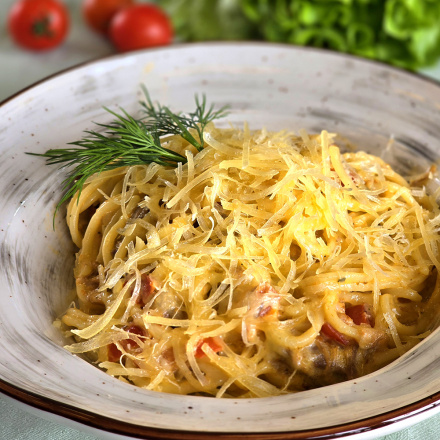 Спагетти, мясо телятины, томаты свежие, икра кабачковая, сливки, Пармезан, чеснок, специи