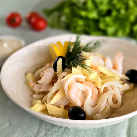 Кальмары, мясо креветки, яблоко свежее, майонез постный