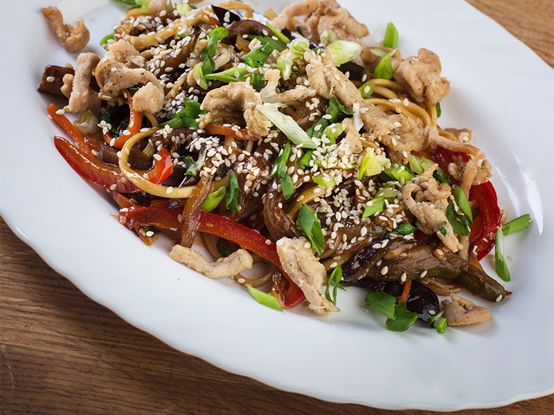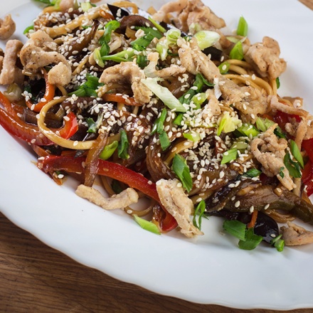 Лапша пшеничная, кусочки свинины, овощи: цукини, перец, морковь,